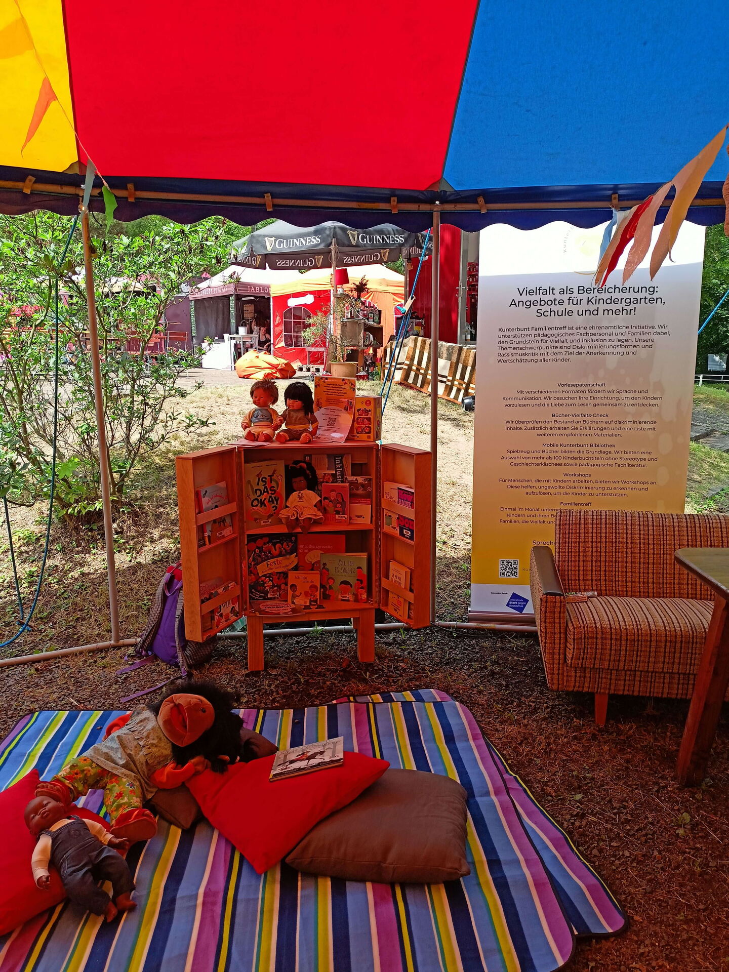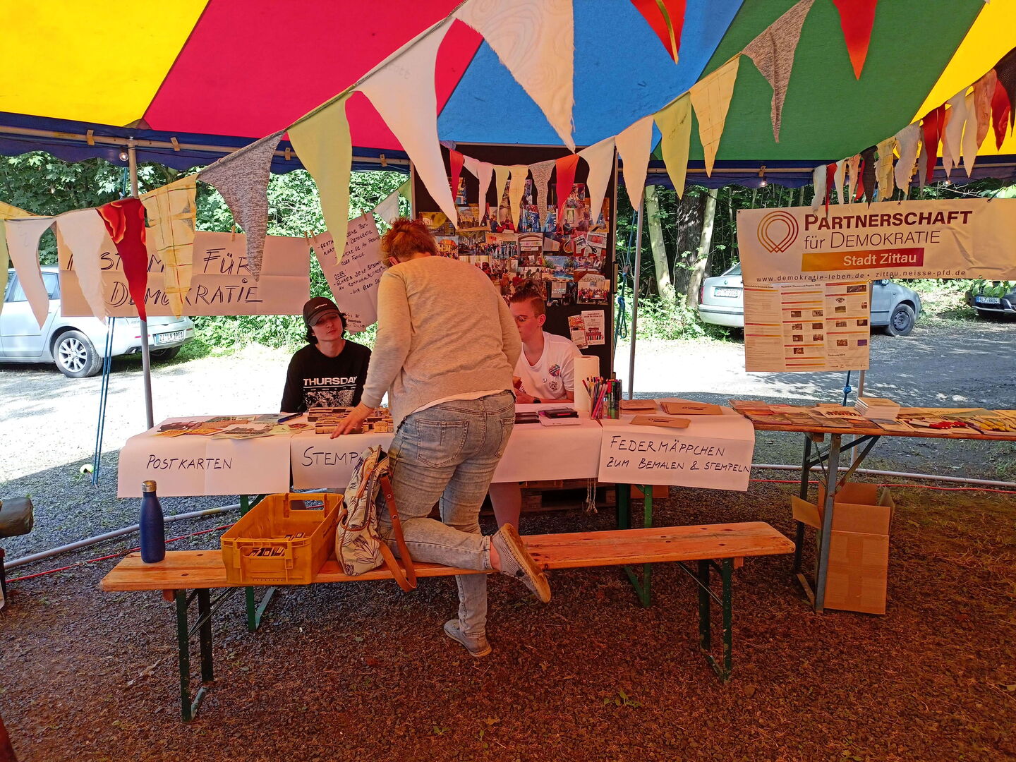 Auch die Partnerschaft für Demokratie Zittau war mit einem reichhaltigen Angebot vertreten. So hatten die Besucher*innen beim Postamt für Demokratie die Möglichkeit, nicht nur Federmäppchen zu gestalten und mit Stempeln in verschiedenen Sprachen zu versehen, sondern auch Postkarten mit Botschaften an Freund*innen und Familie, vielleicht aber auch an Kommunalpolitiker*innen zu versenden. Die Vielfaltsbibliothek bot eine Fülle an Kinderbüchern ohne Stereotype und Geschlechterklischees. Das Jugendbüro Zittau stellte seine Arbeit vor. Außerdem gab es Infos zum Demo- Slam, einem Dialogformat. Dank des großen Engagements gelang es, einen wunderbaren Raum für neue Begegnungen zu schaffen.